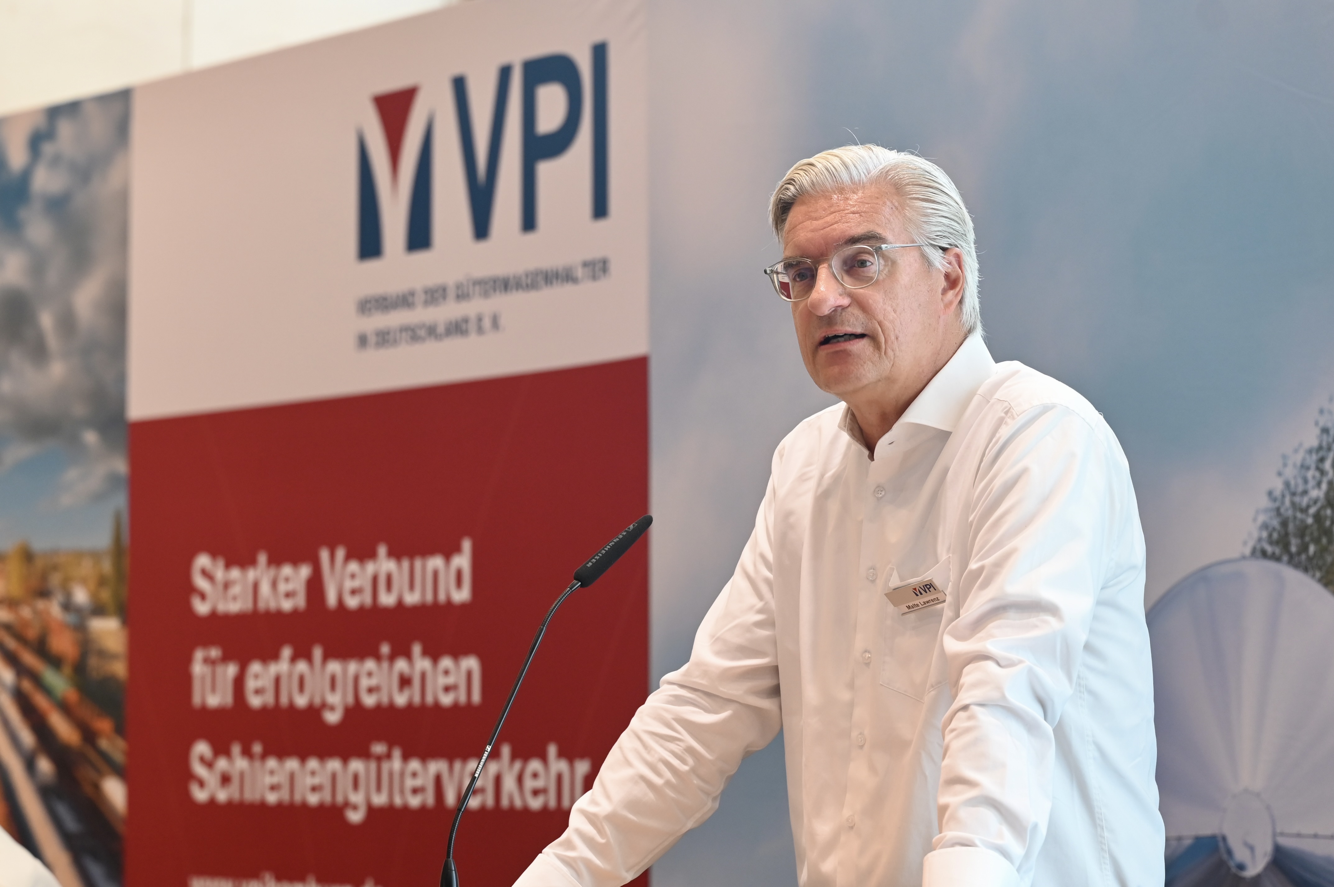 Vor den 185 Vertreterinnen und Vertretern des Waggonhalterverbandes VPI in Dresden forderte der Vorsitzende Malte Lawrenz heute die Politik auf, an dem im Koalitionsvertrag festgeschriebenen Vorrang für die Schiene festzuhalten. Lawrenz unterstrich die Bedeutung, die dem prioritären Ausbau und der Ertüchtigung der Schienenwege für klimafreundlichen Güterverkehr zukommt. "Die Infrastruktur, die wir heute bauen, bestimmt den Verkehrsträgermix der Zukunft", betonte Lawrenz und forderte Verkehrsminister Volker Wissing auf, sich gemeinsam mit der Branche auf die Modernisierung des Systems Schiene zu konzentrieren. „Wir müssen bei den Themen Infrastrukturausbau, Digitalisierung und Automatisierung zügig vorankommen, um das vorgegebene Marktanteilsziel von 25 Prozent bis 2030 zu erreichen“, mahnte Lawrenz. Er bedauerte in diesem Zusammenhang die Signale, die von der kürzlich vom Verkehrsministerium veröffentlichten „Verkehrsprognose 2051“ ausgingen. „Wer von 17 Prozent Marktanteil im Jahr 2051 spricht, verkennt die Potenziale der Branche und verabschiedet sich gleichzeitig vom verkehrspolitischen Gestaltungswillen“, kritisierte Lawrenz.
